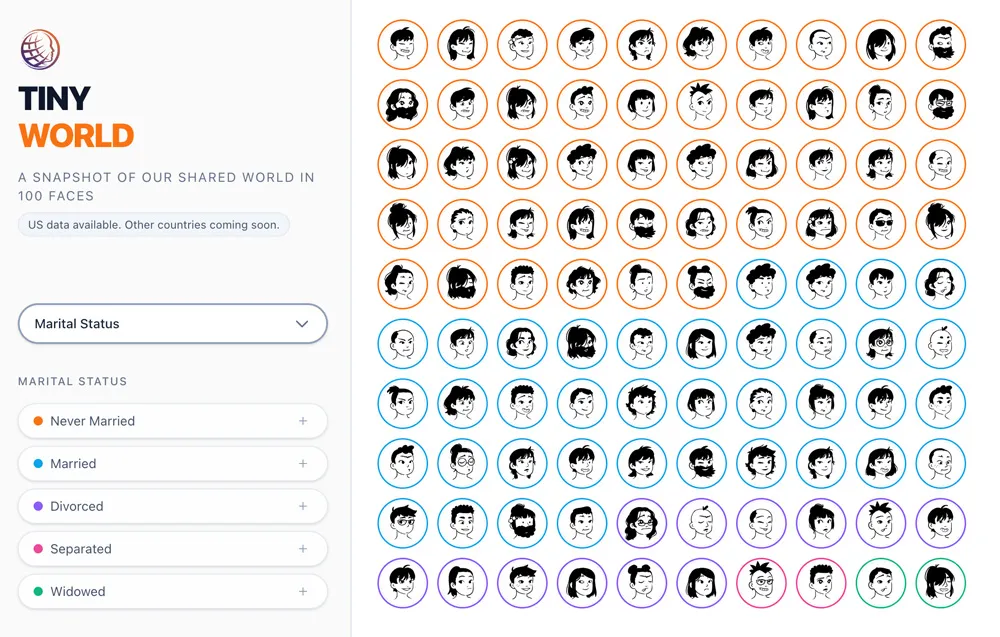 Market researchers spend enormous amounts of time trying to understand who their customers are and what drives their decisions. Tiny World gives analysts a ready-made population to segment, profile, and interrogate without the cost or complexity of running a real survey. Want to understand how income and age interact with technology adoption? Need to build out a demographic persona for a new product launch? Tiny World lets you explore these questions visually, making it easier to communicate findings to clients and stakeholders.